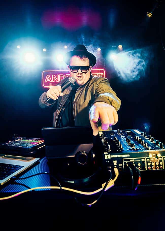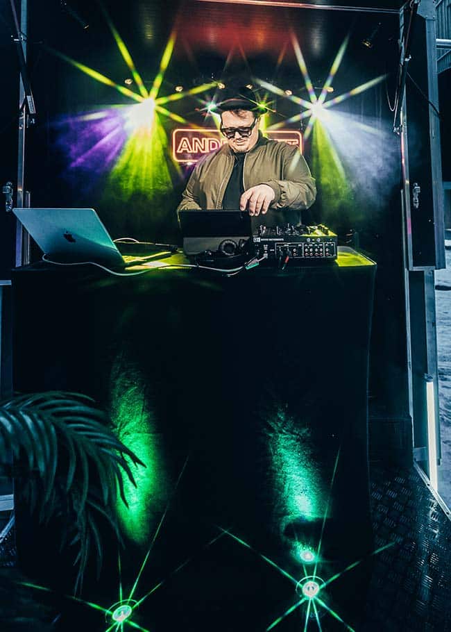 Wenn Dominik als Musiker an euer Fest kommt, dann ist auch schon das ganze Equipment da und sein DJ-Part ist dann auch günstiger als der eines Profi-DJs. Dominik bringt alles mit, beispielsweise auch Discokugel, Nebelmaschine und Lichter…